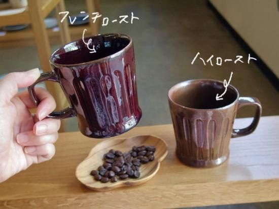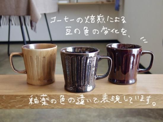 コーヒーの焙煎(ロースト)による豆の色の変化を、釉薬の色の違いで表現しました。