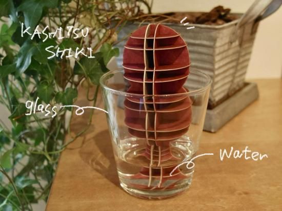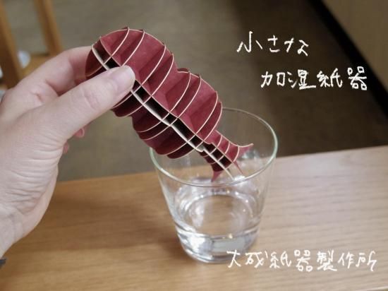 KASHITSU SHIKIに使われているのは、大成紙器製作所が製紙メーカーと共同開発してつくった加湿用紙。水をゆっくりと吸い上げて気化する機能があり、使用環境にもよりますが、KASHITSU SHIKIの形状・サイズだとコップ1杯の水の自然蒸発量に対して約5倍の加湿効果があるのだとか。