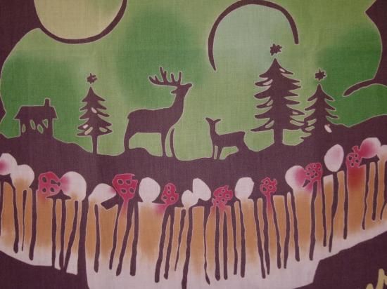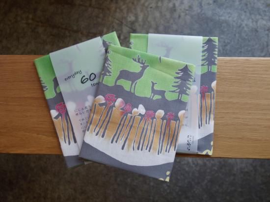 クリスマスの夜に、大きなツリーが届きました。澄んだ夜空を彩るように舞い降りたツリーは、注染のぼかしがぽわっと浮かぶ灯りのようにもみえます。そして大きなツリーの手前には、トナカイやもみの木、お家などが情景を物語っています。今宵はどんなクリスマスのストーリーが生まれているでしょうか。